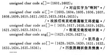 实例做法如下:用汉语拼音作为数组名,以该拼音所包含的汉字的区位码为数组元素,并 将所有一二级汉字以代码形式定义在程序中,这是一个比较烦琐的工作,工作量比较大。