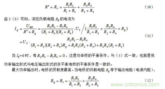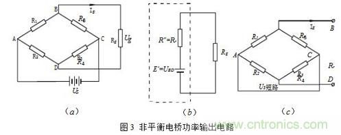 (3)Rg相对桥臂电阻可比拟时的非平衡电桥(功率输出形式)当负载电阻Rg与桥臂电阻可比拟时,则电桥不仅有输出电压Ug,也有输出电流Ig,也就是说有输出功率,此种电桥也称为功率桥。功率桥可以表示为图3(a)。