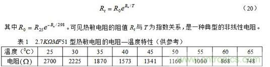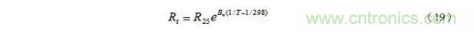 其中R25和Rt分别为25℃和t℃时热敏电阻的阻值,T = 273 + t;Bn为材料常数,其值因制作时不同的处理方法而异,对确定的热敏电阻,可以由实验测得的电阻—温度曲线求得。我们也可以把(19)式写成比较简单的表达式