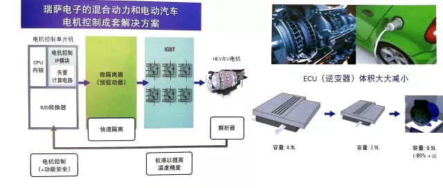 针对中国汽车市场纯电动汽车(EV)路线以及日系车擅长的混合动力汽车(HEV)市场,瑞萨电子提供了相应的解决方案。与汽油发动机驱动的传统汽车不同,HEV和EV在电机运行时会消耗大量电力,因此需要大型高压(数百伏范围内)电池,同时还需要电压检测和充电控制等功能,因此瑞萨电子提供集成单片机、ASIC产品、功率器件(IGBT和功率MOSFET)等HEV和EV系统新技术(例如电机发电机系统,电池管理系统,DC/DC转换器系统)等成套解决方案。