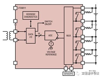 ADI 的最新的第四代锂电池主监控 IC 产品 LTC6811 分别能够 对12个通道的电压和温度进行监测(未来产品提供更灵活的通道 数),极限精度优于1.2 mV。多个 LTC6811 可采用菊花链连接。该 IC提供业界最快的转换速度和最佳数据保护。可在290 μs内检 测12个通道的数据。此外,IC还提供被动式电池单元平衡控制功能。