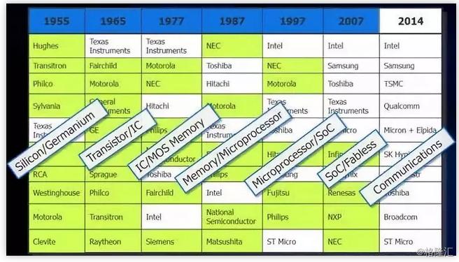 于此同时,半导体产业还具有一定的周期性,基本上美国十年,就会出现一轮新的技术革新。20世纪50年代是硅晶体管的生产商取代锗晶体管制作的10年;20世纪60年代由双极型集成电路驱动;20世纪70年代是MOS存储器;20世纪80年代是MOS微处理器;20世纪90年代是集成了嵌入式微处理器的SoC;最近几十年则是无线通信和无晶圆厂半导体公司(fabless)。