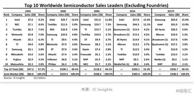 对于全球半导体产业而言,经过几十年的快速发展,各自细分领域已经形成了巨头企业,并且已经占据了绝大部分市场份额。从IC Insights统计的全球半导体产业营收情况中,我们也不难看出,全球TOP10半导体企业基本掌控了全球五成左右的市场份额。新进入者很难撼动巨头们的市场地位,这也是由半导体产业属性所决定的。作为全球经济支柱的半导体产业,具有相对高的门槛。