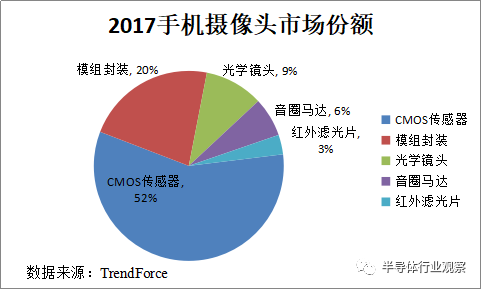 手机摄像头模组的核心零部件主要包括:图像传感器(CIS)、镜头(Lens)、音圈马达(VCM)、红外滤光片(IRCF)等。主要供应商都集中在亚洲的日本、韩国、中国大陆、中国台湾地区。根据TrendForce发布的手机产业链市场数据, 2017年CMOS传感器的市场份额最大,之后依次是模组、光学镜头、音圈马达和滤光片。 双摄应用后,模组封装技术难度增大,镜头要求更高,因此其相应产业链的附加值提升速度已加快。