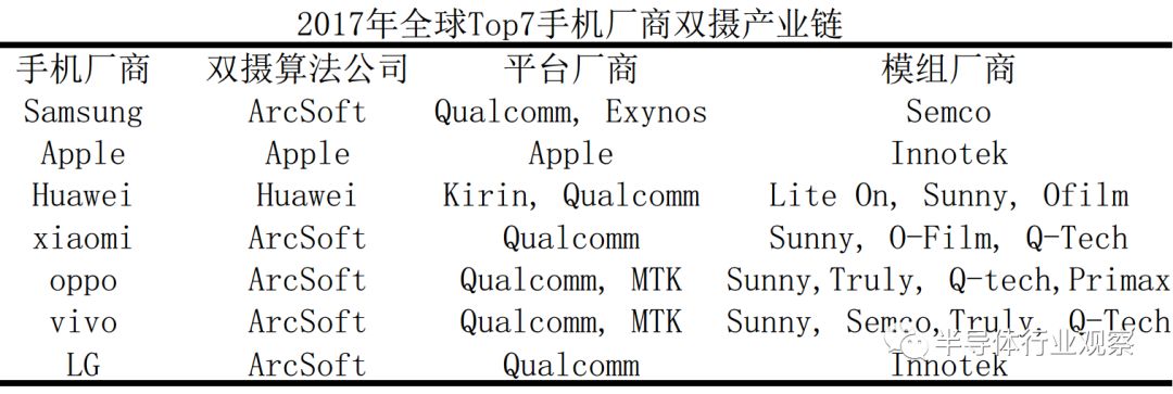 2017年全球top7手机厂商对应的双摄算法公司、处理器平台厂商、相机模组厂商如下所示:
