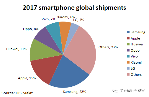 双摄已进入标配期,产业链也基本定格。根据IHS Markit 提供的数据,2017年全球手机出货量市场份额如下。中国手机厂商华为、OPPO、vivo、小米的总市场份额约等于三星和苹果的市场份额之和。而双摄在中高端设备渗透率已超过50%。