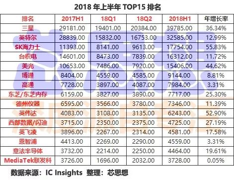 2018年08月21日 | 前15大半导体营收排名出炉,4家销售年增30%以上