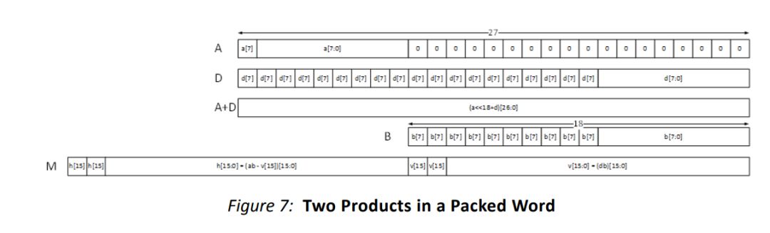 这时候,尴尬的故事发生了,DNN,特别是端测DNN的大部分应用仅仅需要8位精度,如果用牛逼的dsp48就是大炮打蚊子,如果用LUT综逻辑时序又无法满足。这个时候,Xilinx官宣了一份白皮书WP487,给出了一种在NN场景下一个dsp48怎样实现并行实现两个8-bit精度的方法。简而言之就是把两个8-比特数拼成一个27位的数,当中隔了10位然后和第三个数相乘,乘法的结果的MSB和 LSB分别是两个乘法的结果。总之,尴尬癌还是有那么点的。