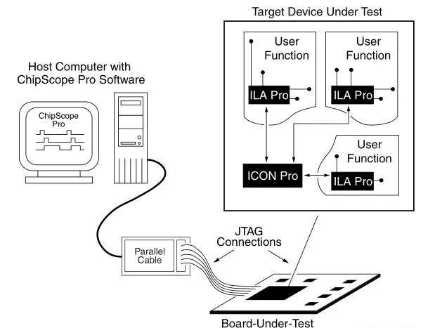 但和RTL simulation相比,Prototype的debug性差也是路人皆知的。常见的FPGA Prototype的debug方法是人为的在RTL中设置观测点(probe),调用片上BRAM存储,然后用类似JTAG的串口方式读取存储信号,再现波形。显然地,这种观测方法方法是在和有实际功用的RTL竞争片上BRAM资源,特别是在存储深度大,位宽宽的情况下。更严重的问题是如果发生了新一轮规模性的修改probe,而导致的重新综合与实现可能会耗去大量时间,可能还不如simulation的效率高。目前主流的FPGA的debug方案基本都是如上思路,如下图中的ChipScope+ILA模式。
