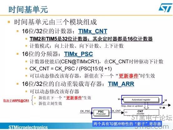 在谈预装寄存器及影子寄存器的差别前,不妨先对STM32定时器的时基单元做个基本了解。STM32各系列的定时器结构和框架基本是一样的,时基单元也一样。 下面时基单元是以STM32F3系列为参考。