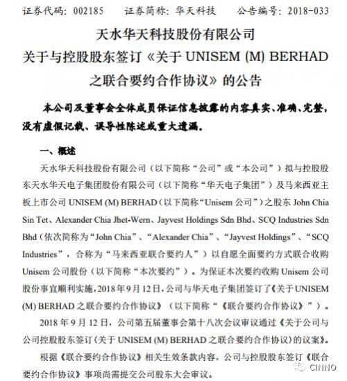 2018年09月13日 | 志在必得,华天科技砸29.92亿收购Unisem