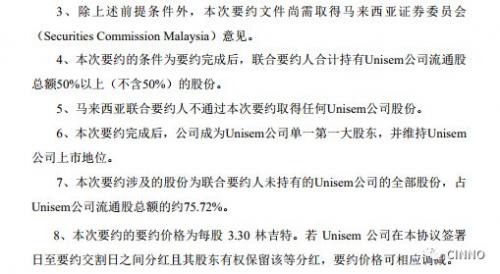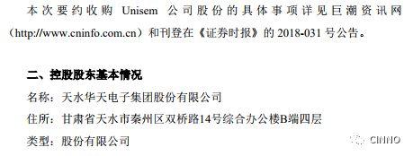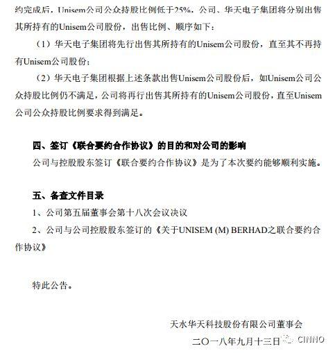 公告内容指出:天水华天科技股份有限公司(以下简称“公司”或“本公司”)拟与控股股东天水华天电子集团股份有限公司(以下简称“华天电子集团”)及马来西亚主板上市公司UNISEM (M) BERHAD(以下简称“Unisem公司”)之股东John Chia Sin Tet、Alexander Chia Jhet-Wern、Jayvest Holdings Sdn Bhd、SCQ Industries Sdn Bhd(依次简称为“John Chia”、“Alexander Chia”、“Jayvest Holdings”、“SCQ Industries”,合称为“马来西亚联合要约人”)以自愿全面要约方式联合收购Unisem公司股份(以下简称“本次要约”),初步确定要约价格为每股3.30林吉特,若Unisem公司在本公告披露日至要约交割日之间分红且其股东有权保留该等分红,要约价格可相应调减。