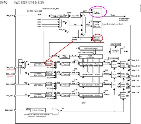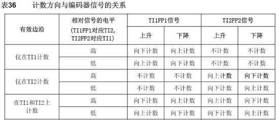 STM32的每个TIMER都有正交编码器输入接口,TI1,TI2经过输入滤波,边沿检测产生TI1FP1,TI2FP2接到编码器模块,通过配置编码器的工作模式,即可以对编码器进行正向/反向计数。