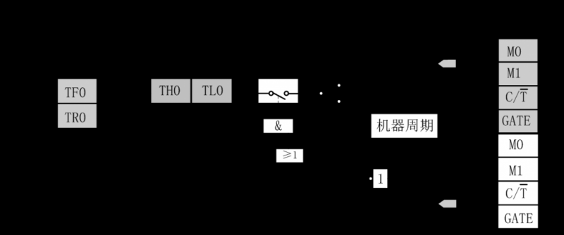 GATE:门控位。GATE=0时,只要用软件使TCON中的TR0或TR1为1,就可以启动定时/计数器工作;GATA=1时,要用软件使TR0或TR1为1,同时外部中断引脚INT0/1也为高电平时,才能启动定时/计数器工作。即此时定时器的启动条件,加上了INT0/1引脚为高电平这一条件。