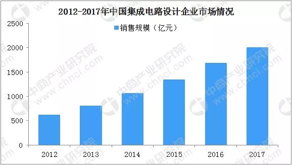 2017年,我国集成电路设计行业销售收入为2074亿元,比2016年的增加430亿元,增长率为26%,占集成电路行业的比重由2016年的37.9%提升至38.3%,继续保持高速增长,在集成电路各细分行业中占比最高。