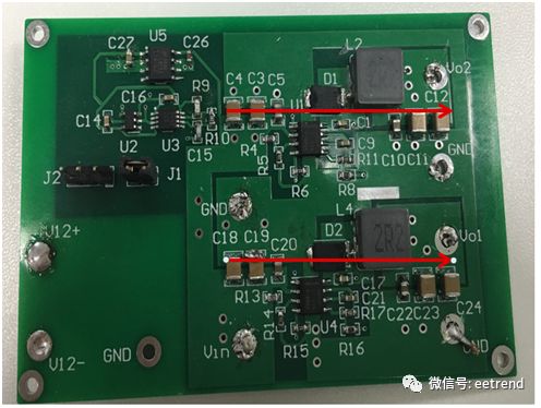 以LMR14030-Q1构成的两路输出降压转换器DC/DC降压变换器为例,如图1和图2所示的两种不同的印刷电路板(PCB)布局。红线显示的是功率回路在布局中的流动方式。图1中功率回路的流动方向呈U型,而图2中的流动方向呈I型。这两种布局是汽车和工业应用系统中最常见的布局。那么,哪一种布局更好呢?