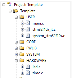 然后我们再在Keil MDK中点击HARDWARE文件,然后把刚才保存的time.c和time.h文件都给添加到此工程中去。(这些步骤以后我就不再一一说明了),添加完成如下图