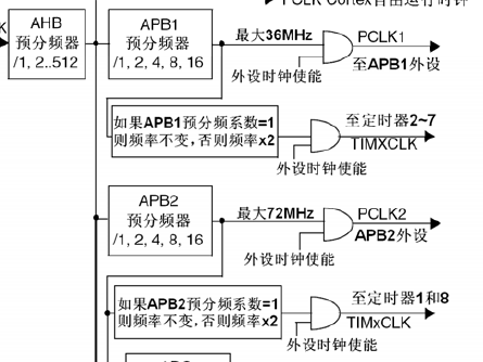 那么APB1时钟怎么转至TIMxCLK时钟呢?除非APB1的分频系数是1,否则通用定时器的时钟等于APB1时钟的2倍。