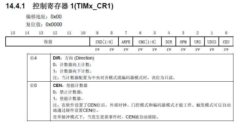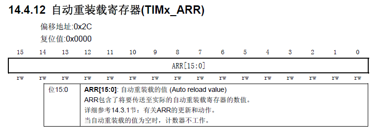 注意:该寄存器在物理上实际上对应着2个寄存器。一个是我们直接操作的,另一个是我们看不到的,这个看不到的寄存器叫做影子寄存器。实际上真正起作用的是影子寄存器。根据TIMx_CR1位的APRE位的设置,APRE=0时,预装载寄存器的内容就可以随时传送到影子寄存器,此时两者是互通的;APRE=1时,在每一次更新事件时,才将预装在寄存器的内容传送至影子寄存器。