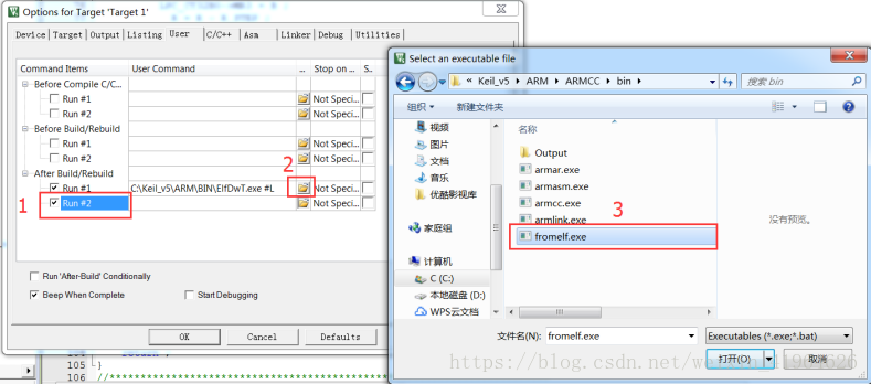 2. 点击图标选择 fromelf.exe (在 Keil 软件安装目录下:Keil_v5 -> ARM -> ARMCC->bin)3. 双击打开fromelf.exe