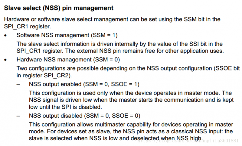 意思是说 SPI主模式下,启用石硬件NSS控制模式,并且NSS输出使能后,只要SPI模块打开,其NSS引脚就输出低电平,而且低电平将持续到SPI模块关闭(注意这里并不是发送数据完成,这就尴尬了,还用要手动去开关SPI模块),到这里是乎找到些线索,那就手动去关闭SPI和使能模块吧,将会用来下面的两个接口函数(也可以直接操作寄存器):