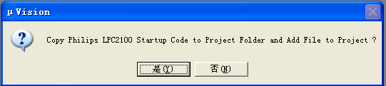 当创建一个新的工程时,µVision会自动为所选择的CPU添加合适的启动代码。如下图,点击确定即可复制LPC2100的启动代码。