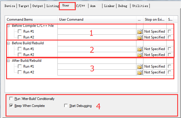这个选项是针对用户而设计的,一般不常用,方便用户执行一些程序。比如:编译完代码之后,我要将生成的Hex文件拷贝到其它地方。