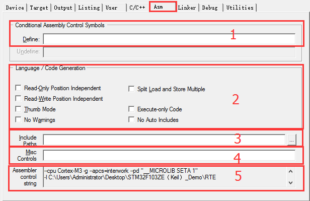 从这个选项的排版和结构可以知道,和前面一个选项“C/C++”类似,只是这里针对的是Asm。因此,这一章节只简述,不会重点强调,可以参看上一章节进行对比,第3、4、5处和C/C++选项一样,这里不讲述。