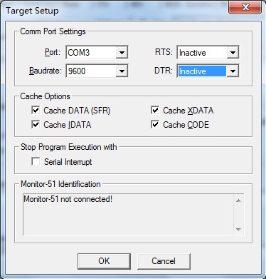 6、运行keil,打开工程项目文件,修改调试参数,即菜单project-->option for target,选debug页,点击右边的use keil monitor 51 driver,点击seting按钮,选择串口和波特率,注意,要和烧片子时用的波特率一致,一般用9600。需要注意的是,如果串口为自动方式(即除了三根通信线外,还接了RTS和DTR),需要将RTS和DTR设置为inactive.