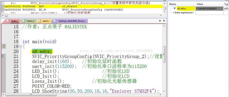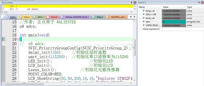第二个问题:Watch1窗口中变量adcx值不能实时显示?