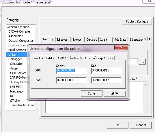 比如我的是RB型号的单片机,所以就设置为ROM 0x08000000~ 0x0801FFFF RAM 0x20000000 ~ 0x20004FFF