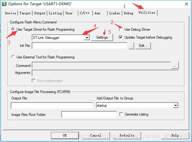 4.点击Utilities选项卡,先取消use debug driver ,然后再选择选择ST-Link Debugger,点击Settings