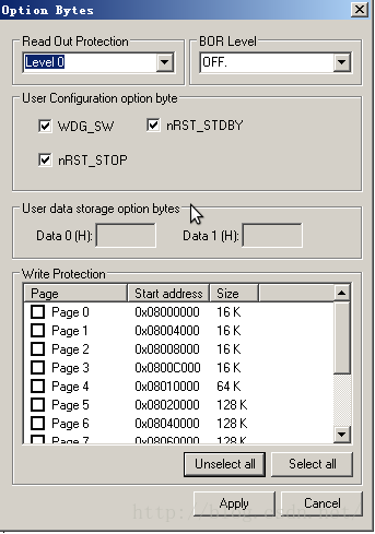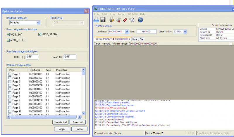 然后,再次启动STM32 ST-LINK Utility,先不要点“Connect”,直接进入Target > Option Bytes菜单 将BOR选为0 将Write proctection 都清空,如下图所示: