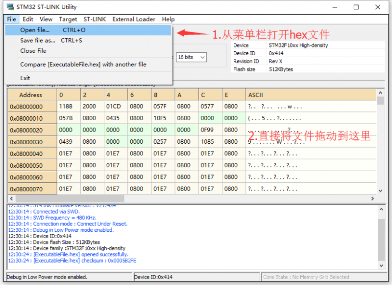 在上一步连接好芯片,并正确识别芯片之后,打开需要下载的程序(hex)文件。打开hex文件可以从菜单栏(File -> Open File)打开,也可以直接讲hex文件拖动到FLASH区域(就像从电脑复制文件到U盘一样)。