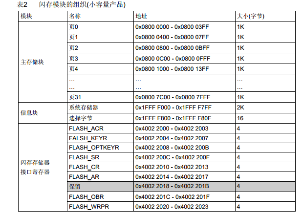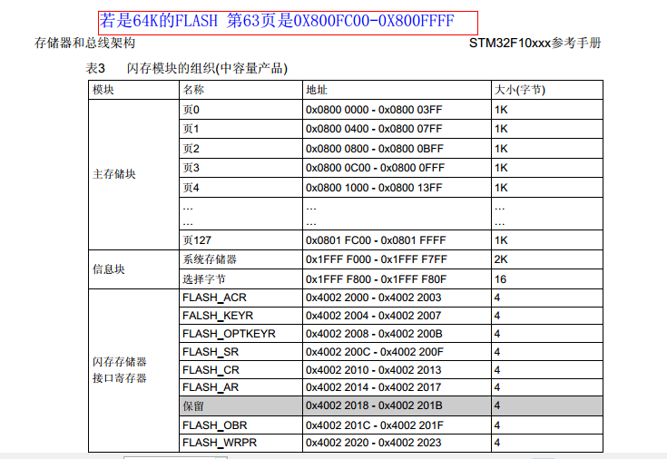 通常情况下程序也不会把FLASH写满;在没满的时候我们可以把最后一或两页用来模拟EEPROM;这样我们就可以不用在外部另外来加EEPROM了。下面是STM32F103中文手册关于FLASH的截图;由于我用的是STM32C8T6做的实验;手册中没有给STM32C8T6的FLASH的地址信息,容量是64K,可以算出第63页地址是0X800FC00-0X800FFFF。