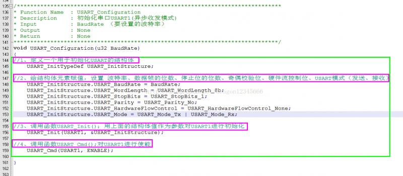 下图是通过调用库函数对USART1的参数进行配置,将其配置成异步收发模式、波特率用户可以自定的串口: