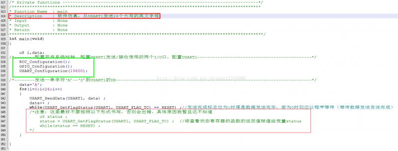 首先:在主函数部分先要(调用自己编写的函数)对USART要用到的I/O端口进行配置、打开系统时钟配置和对USART1进行参数配置