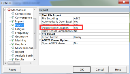 ⑧ 进行如下设置Tools——Options——Export——Include Node Location——Yes,确保输出的厚度文件及应力文件中包含节点坐标信息;