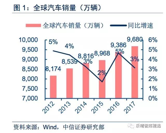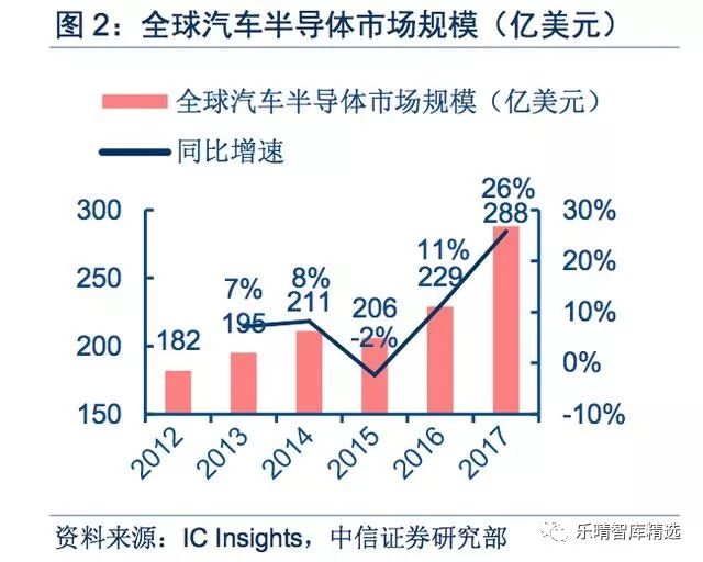 2017年全球汽车销量9680万辆(+3%);汽车半导体市场规模288亿美元(+26%),增速远超整车。