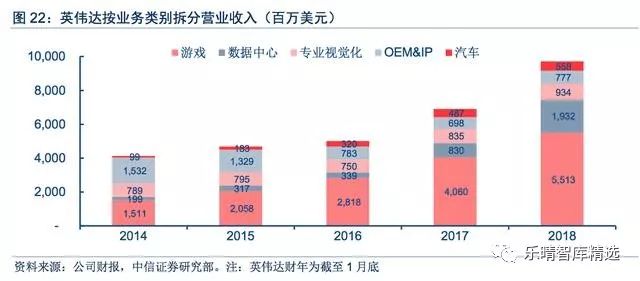 按照应用类别拆分,英伟达的业务包括游戏、数据中心、专业视觉化、OEM&IP、汽车业务五类。其中游戏为主要收入来源,2018财年收入占比57%。