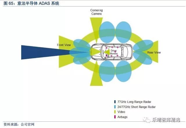 雷达芯片:1)77GHz远程雷达系统,采用SiGe(硅锗)技术保证高频功能和耐用性,可用于避撞系统;2)24GHz近/中程雷达系统,同样采用SiGe(硅锗)技术,可用于盲点监测系统。