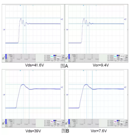 图2-A表示的是开关管Q1没有加RC吸收电路的Vds电压波形,图中明显的看出,当开关管Q1断开时,Vds电压迅速上升至最高点,而后伴随这震荡下跌,震荡频率为20MHZ。