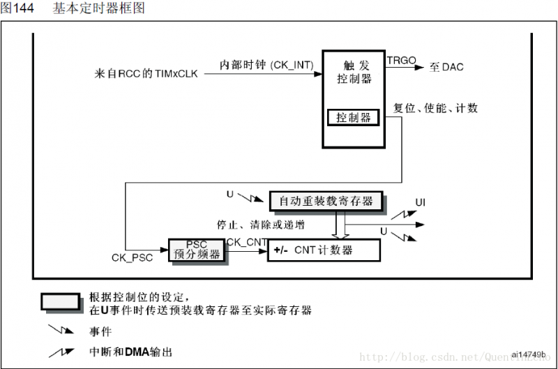 在STM32中,基本定时器有TIM6、TIM7等。基本定时器主要包含时基单元,提供16位的计数,能计数0~65535。基本定时器除了计数功能以外,还能输出给DAC模块一个TRGO信号。基本定时器框图如下: