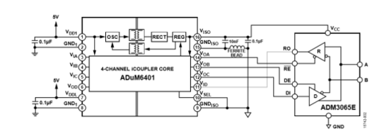 不过,以50Mbps数据速率工作的前提是使ADM3065E工作在3.3 V电压下。 如果需要在5V电压下工作,可以将ADuM6000上的VSEL引 脚连接到VISO,但支持的最大数据速率会降低(例如,<10 Mbps)。更多信息,请参考ADuM241D和ADuM6000数据手册。 ADuM6401和ADuM6000 isoPower器件中的DC/DC转换器 可为ADM3065E(和ADuM241D)提供稳压隔离电源。这 两款isoPower器件利用高频开关元件,通过变压器传输功 率。用户必须遵循辐射标准进行印刷电路板 (PCB) 布局。