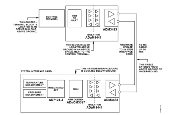 而在电池供电系统、一些对续航敏感地应用(如井下、采矿)以及在4 mA至 20 mA环路中工作的过程控制系统中,往往对低功耗工作模式具有较高需求。ADI公司的微功耗数字隔离器 ADuM1441在关断模式下的静态功耗低于23 μA 。ADI公司提供的ADM3483 3.3 V、250 kbps RS-485收发器的静态功耗也极低,关断模式下通常仅2 nA。 图1所示为适合井下应用稳定可靠的低功耗隔离式RS-485 解决方案。ADM3483和ADuM1441共用可提供一条通往远程地下测量节点的可靠低功耗链路。系统接口卡包括 ARM® Cortex® 微控制器单元 (MCU)、ADuCM3027和集成 模拟前端 (AFE)AD7124-4,用于远程温度和压力测量。系统接口卡的固件更新通过远距离RS-485电缆提供,更新后能够在最长1 km的远距离内实现低数据速率传输(例如,9.6 kbps)。