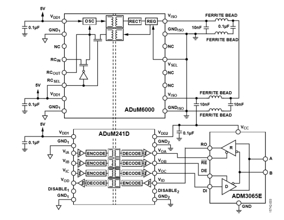 利用iCoupler和isoPower技术,可以向ADM3065E中增添兼具加强绝缘和5kV rms瞬态耐受电压的电流隔离。 ADuM6401提供了所需的四通道5kV rms信号隔离、最高 25 Mbps 的工作速率以及集成式DC/DC 转换器。 ADuM6401配合ADM3065E(如图1所示)需将VISO引脚配置为3.3 V,具体方法是将VSEL引脚连接到GNDISO引脚,并将5V电源连接到VDD1引脚。在3.3V电压下工作,即使数据速率达25 Mbps ,也可以确保ADM3065E 仍保持在 ADuM6401的负载能力范围内。利用ADuM241D四通道数字隔离器和ADuM6000隔离式 DC/DC 转换器,可以实现50 Mbps 数据速率以及 ADM3065E隔离,如图2所示。ADuM241D的数据速率最高可达150 Mbps,能够提供完全支持ADM3065E以50 Mbps数据速率工作所需的精确时序。