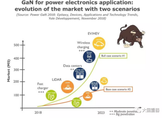 多个企业,如EPC和Transphorm,已经获得汽车认证,为GaN的潜在增长做准备。此外,BMW i Ventures对GaN系统的投资清楚地表明了汽车行业对基于的GaN的EV/HEV技术解决方案也感兴趣......在全球范围内,Yole的第二个场景,名为Bull Case Scenario,更具发展性,条件是有领先的商业制造商采取GaN无线充电解决方案