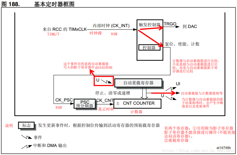● 发生如下更新事件时会生成中断/DMA 请求:计数器上溢(计数器上溢会产生更新事件,更新事件能够产生中断/DMA请求)。