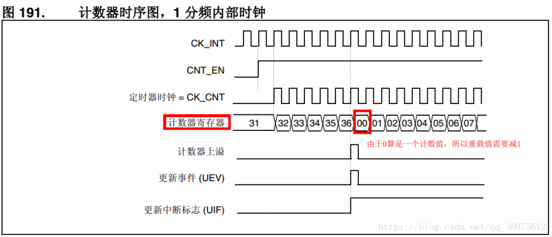 ARR 为要装载到实际自动重载寄存器的值。注意:自动重载值写入10000;真实写入的值只能是9999。原因看下图便知。