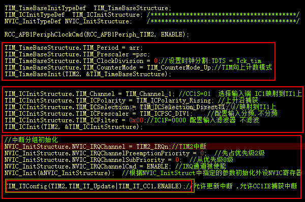 5、添加相关中断函数,这里设计到更新中断和捕获中断。需要说明的是,本实验的主要目的是为了测试捕获实验,通过不惑实验可以实现对固定频率的脉冲频率检测,或者脉宽检测等,本实验中刚好输出了PWM波,所以可以尝试的测测频率。思路是这样的:既然是固定频率和占空比的PWM波,那我可以连续测两次上升沿,将两次上身沿之间的计数器相减,然后根据定时器预分频值计算频率。由于在实际测试中存在所测频率很低,可能在两个上升沿之间定时器计数器更新了好几次,所以需要添加更新中断来记录这个更新(图4)。其中"Time2_Ch1_Cap_FreVal = TIM_GetCapture1(TIM2) + (Arr_Val + 1)*(Time2_Ch1_Cap_Sta&0x1F) - Time2_Ch1_Cap_Val;"是计数记录的最终结果值。